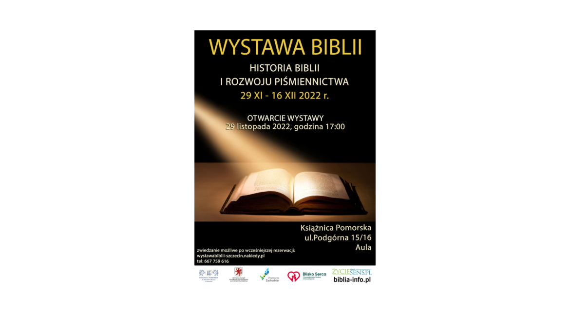 Książnica Pomorska wraz z  Chrześcijańską Służbą Charytatywną „Blisko serca” we współpracy z Kościołem Adwentystów Dnia Siódmego, zbór Szczecin – Centrum zaprasza na wystawę, której tematem jest Biblia – fundament chrześcijaństwa.