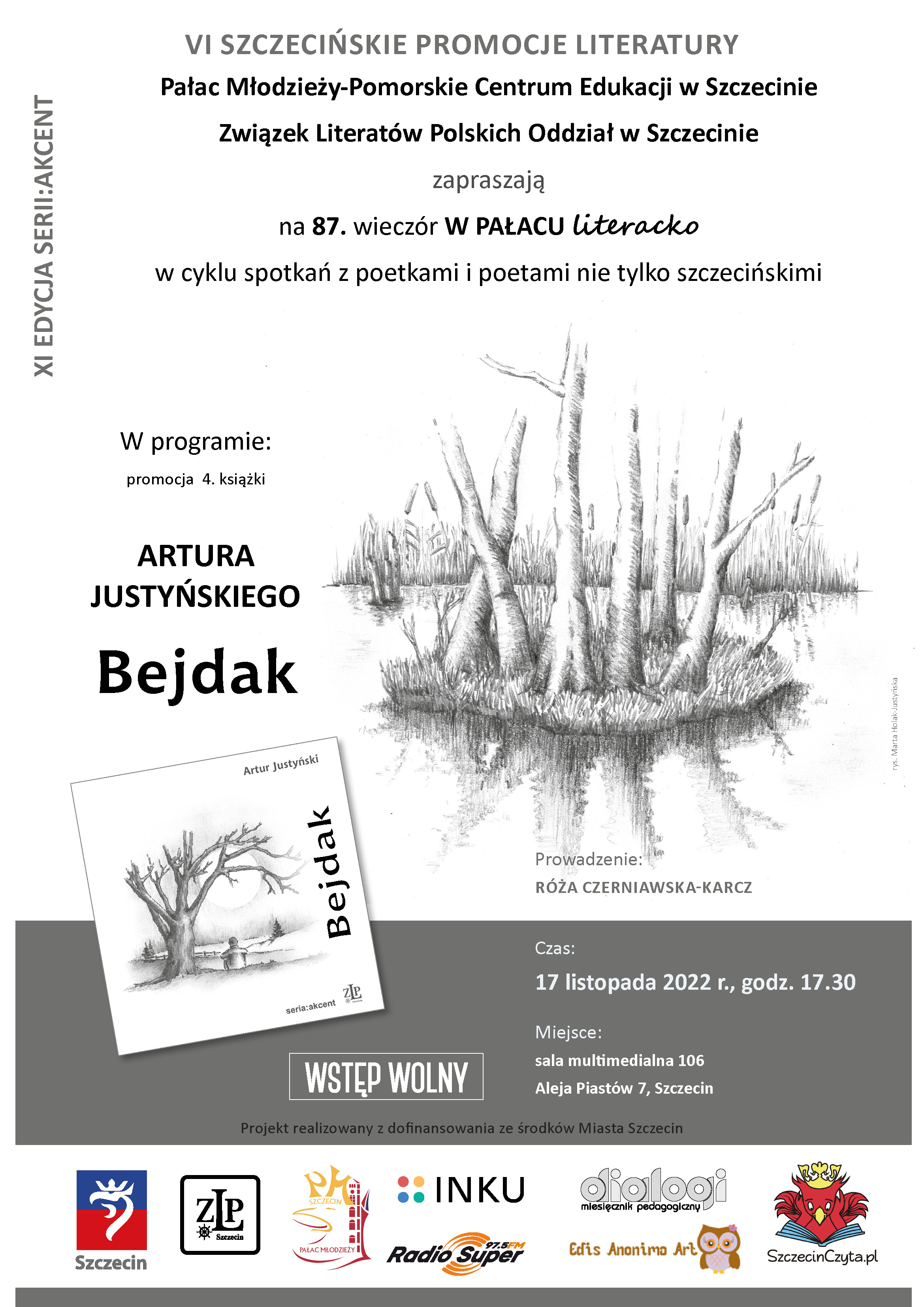 Tak więc w imieniu organizatorów zapraszamy 17 listopada 2022 roku, o godzinie 17.30 do Sali multimedialnej 106, w Pałacu Młodzieży-Pomorskie Centrum Edukacji w Szczecinie – na 87. wieczór z cyklu spotkań z poetkami i poetami nie tylko szczecińskimi. W programie spotkania prezentowana będzie 4. książka Artura Justyńskiego wydana jako 80. pozycja w serii:akcent, w ramach XI edycji serii, w projekcie VI Szczecińskie Promocje Literatury. Zadanie publiczne realizowane przez Związek Literatów Polskich Oddział w Szczecinie jest współfinansowane ze środków Miasto Szczecin.